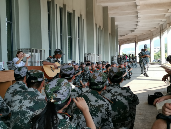 早晨,在一段时间的训练后,同学们迎来了难得的休息时光。此时,众人各展所长。会弹吉他的同学倾情献上《天空之城》、《平凡之路》等等,舒缓悠长的旋律浸润着每个人的身心。而随后两位男生的定腿对战中,他们的毅力让大家惊叹——两人竟都超过了五分钟。最后双方一同放下腿。