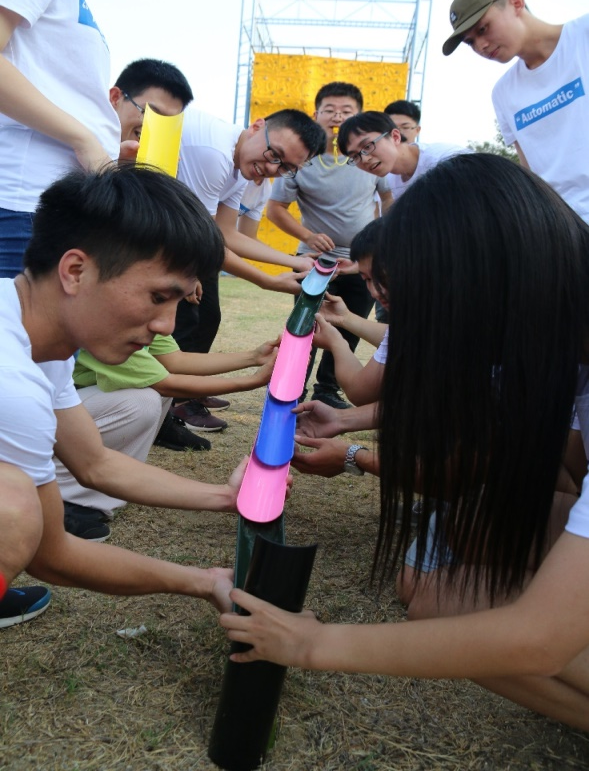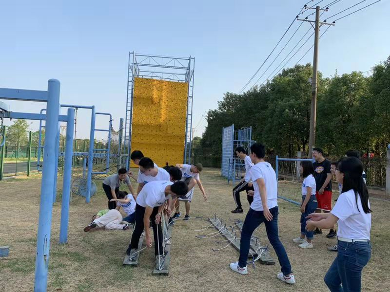 整个拓展活动由四个团队游戏构成。“铁轨单车”要求同队同学双脚分别站在两个木板上,同时发力使得木板移动到目标点;“能量传递”要求同学每人持半圆形的管道为小球拼接成一个轨道,使得小球能顺利到达目标杯中,其间球不能停、不能碰、不回滚、不掉落;“同心圆”要求同学手持鼓绳,共同将鼓上小球击高并积累击高次数,同学们时而迅速移动,时而缓步而行,时而保持静止,为了相同的目标而共同努力;最后一个挑战是“穿越电网”,同学们需要在20分钟内穿越只有22个洞口的“电网”,身体各个部位均不得触碰“电网”,同学们齐心协力,最终用19分钟顺利完成了任务。
