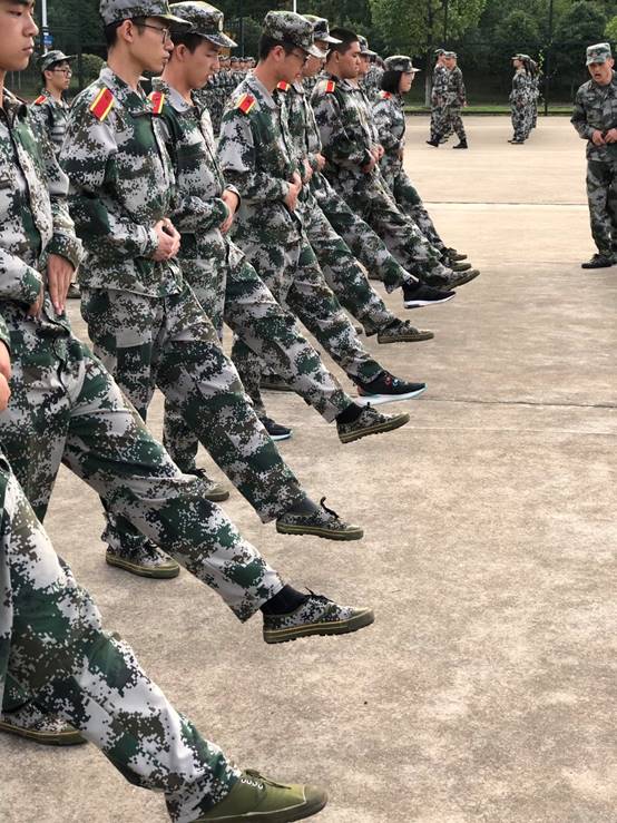 正步要求一脚踢出前方,脚掌需要与地面平行一段时间,所以,对于初学者来说,在踢出步子时保持身体的平衡是第一个难点。为了解决这个问题,教官要求同学在踢正步时保持一腿悬空30秒。一开始,有些同学偶尔会失去平衡,但在教官有关步伐幅度与重心调整的指导下,经过了一个上午的训练,同学们逐渐找到了要领,踢出了坚挺有力的步子。2017班的葛天震同学在踢正步得到了教官的肯定后,忍不住笑出声来,他说:“我真的从小就爱看解放军踢正步,没想到有朝一日我也可以走出这样的步子了。就感觉我每走一步都离梦想中的中国军人又进了一步。”