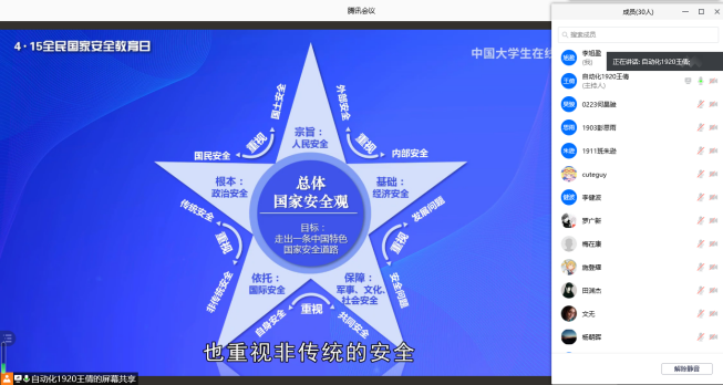 智能1801班的彭志颖印象最深刻的是汪明教授举了很多近几年来许多热点事件的例子,让他深刻地感到,破坏国家安全的行为,正频繁地发生在我们身边:以前,谈及国家安全,我第一个想到的是外国间谍组织对我国的渗透。我曾看过一个真实发生的事件,多年前,一个居住在海港附近的人家,由于自身的愚昧,在伪装的外国人的利诱下,定期拍摄海港照片提供给外国人,使外国人窃取了我国最真实的海军信息。实际上,总体国家安全观是一个很广的概念,它既包含外国敌对势力对我国经济、文化上的破坏,如中美贸易战、14年香港严重的“占中”事件,这些给我们带来了国家经济受阻、国家意识形态受到动摇的风险;也包括非人为(可能)的突发事件,例如最近的新冠疫情。总之,总体国家安全观就是对这种潜在风险的一种防范,需要我们每个人树立这种意识。
