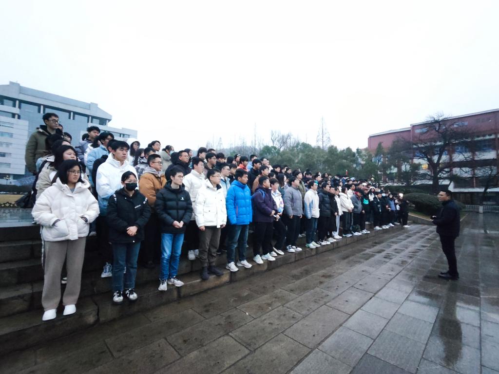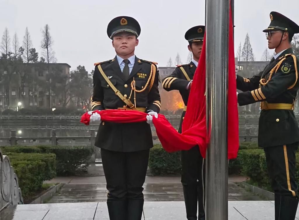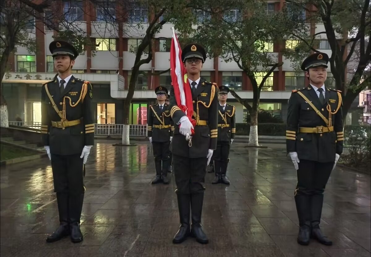3月4日清晨,2020级本科毕业班参加公司升旗仪式。6点20分,毕业生们冒着淅沥沥的小雨提前到达升旗现场,静待国旗升起。辅导员连选、周一苇与公司300余名毕业生代表一同观礼升旗仪式。