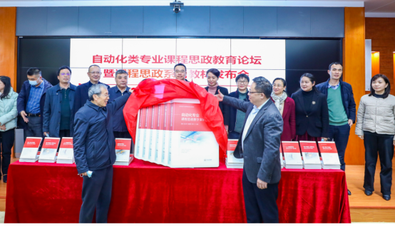 在全场师生的见证下,全国教书育人楷模,中国工程院院士桂卫华宣布:《自动化类专业课程思政系列教材》丛书正式出版发行。桂卫华院士与陈翔副董事长一起为新书揭幕,会场随即响起热烈的掌声。在场嘉宾为新书的发布共同庆祝并合影留念。