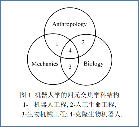 大部分工业机器人和行走机器人,是模仿人类上肢和下肢功能的机器人或机械人,是机械人工程学1的研究领域。应用生物工程技术研究人类生命和生殖问题,是人工生命工程学2的研究范畴;如果把生物视为一种内含DNA链的特种机械装置,那么人工生命工程学是研究有生命的机器人问题。生物学与机械学的交集,产生了生物机械工程学3,研究仿生机械和仿生机器人。人类学、生物学和机械学三者之交集部分4,研究用生物工程方法和技术制造拟人机器人,即无性系生物机器人或无性系人,也可称为克隆人或克隆机器人。这应是人类研究的一个禁区,也是本书作者提出的对智能机器人严峻挑战的一个话题。