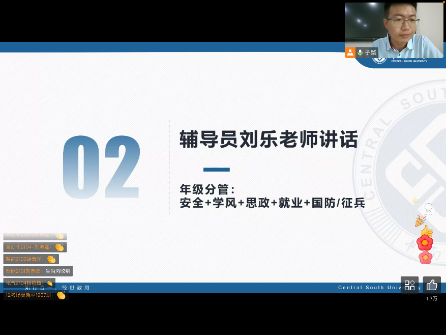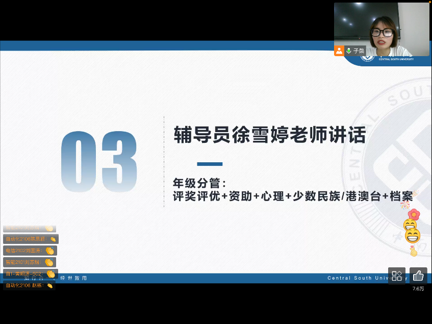 2022年9月9日下午两点,2021级线上年级大会顺利召开。2021级辅导员刘乐老师、徐雪婷老师及2021级全体同学参加本次大会,会议由徐雪婷老师主持。
