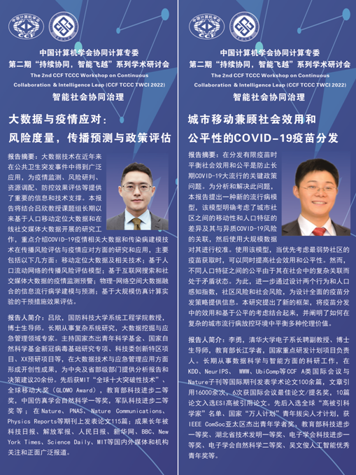 清华大学李勇教授以《兼顾效用与公平的疫苗分配》为主题进行分享,指出公平与效率的取舍是公共资源分配和社会治理中的经典难题,在新冠病毒引发的公共卫生危机和在全球范围持续短缺的疫苗供给背景下,如何制定疫苗分配策略以兼顾社会公平和效用具有重要的现实意义和理论意义。首先,从社会治理的伦理价值难题——医疗资源分配为例,介绍了研究背景,认为分配与疾病监测、治疗相关的资源时,效用与公平往往存在冲突。随后,李教授介绍了新冠疫情中人群风险不平等与疫苗资源有限的研究,认为如何分配有限的疫苗资源,是公共卫生决策的难题。其次,介绍了缺乏对疫苗分配的伦理影响的全面分析这一研究现状,认为疫苗分配倡议普遍强调效用和公平的重要性,但缺乏实证研究,而科学研究关注效用最大化,但忽视对公平性的分析。随后,介绍了其研究创新,在新冠疫苗分配的场景中量化效用与公平,量化效用是指人群整体死亡率的下降,量化公平是指不同人群死亡率的基尼系数变化。最后,提出综合考虑移动和人口属性异质性的仿真模型,以揭示疫苗分配过程效用与公平的关系,提出单维度策略无法兼顾效用和公平的原因,总结了解决城市公共卫生难题的智能化新思路。与上一个报告互为支撑,共同致力于后疫情时代的应对。