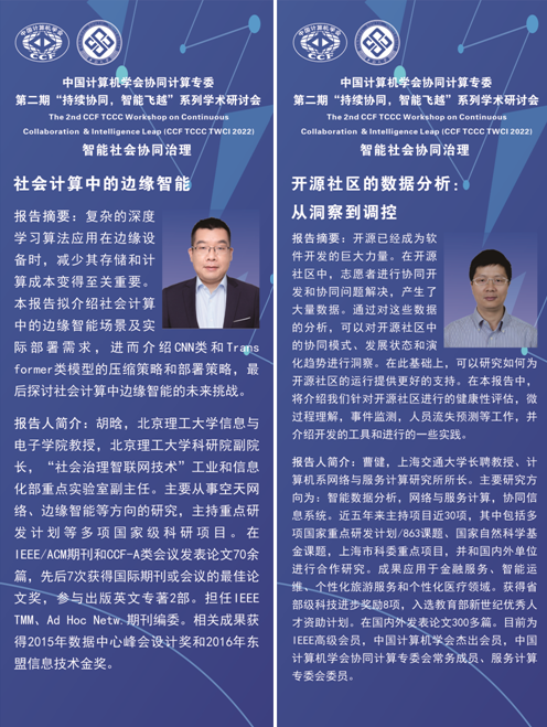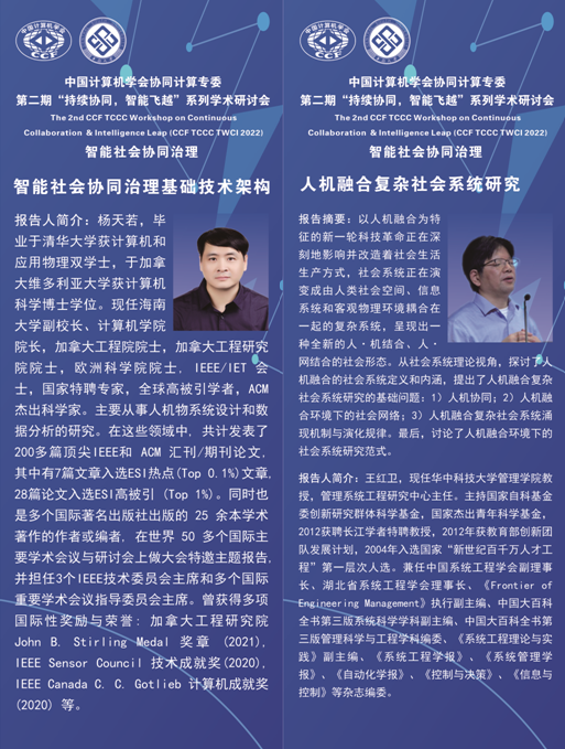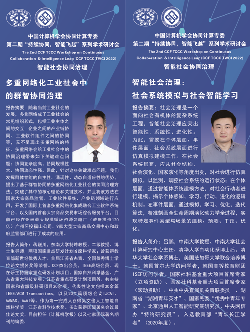2022年9月30日,由中国计算机学会(CCF)主办,CCF协同计算专业委员会承办,3044永利集团社会计算研究中心、复旦大学社会计算研究中心、3044永利集团、3044永利集团公共管理公司、共同协办的CCF协同计算专委会第二期“持续协同,智能飞跃”系列学术研讨会,通过“线上与线下相结合”方式成功举办。本次会议主题为“智能社会协同治理”,邀请八位资深专家分别从治理基础设施、人类群体行为、社会系统建模、复杂系统治理、网络舆情治理、在线社区治理、公共卫生治理、社会群体智能、治理理念与框架等角度分享最新研究内容,从诸多方面展示智能社会治理的理论、技术、实践,并围绕智能社会协同治理核心理论、关键技术和发展趋势深入研讨。吕鹏教授(3044永利集团社会计算研究中心)、卢暾教授(复旦大学社会计算研究中心)共同担任会议主席。