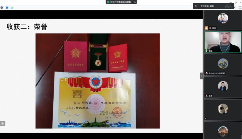 接下来,优秀退役老员工士兵代表谢彪、戴勇军、胡铭欣同学讲述了参军入伍的感受。目前,三位19级同学现已全部保送硕士研究生,他们与同学们推心置腹,分别介绍了在部队的工作、生活,返校后的保研推免、评奖评优,毕业后升学公考等多方面的发展空间,表示公司提供大量优惠政策,保障员工顺利入伍、返校读书,以此勉励学弟学妹勇敢投身部队,实现报国梦想。