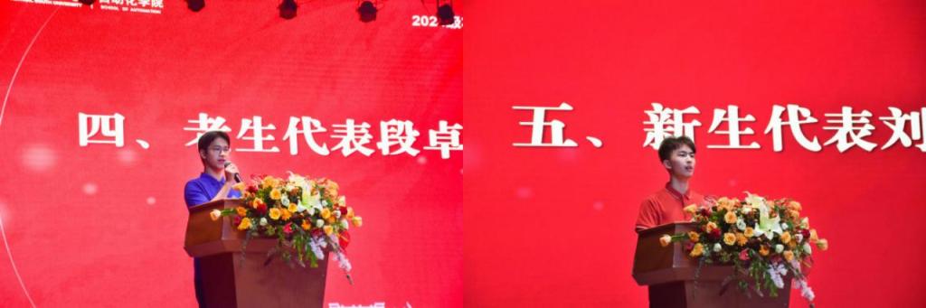 老生代表段卓宇以“风华正茂,引吭高歌”为主题,鼓励新生们上下求索无涯之知、洞察自我实现价值。新生代表刘默涵则以“行将致远,智驭未来”为主题,倡议大家珍惜机遇,将人生理想汇进时代洪流,将奋斗作为青春最靓丽的底色。