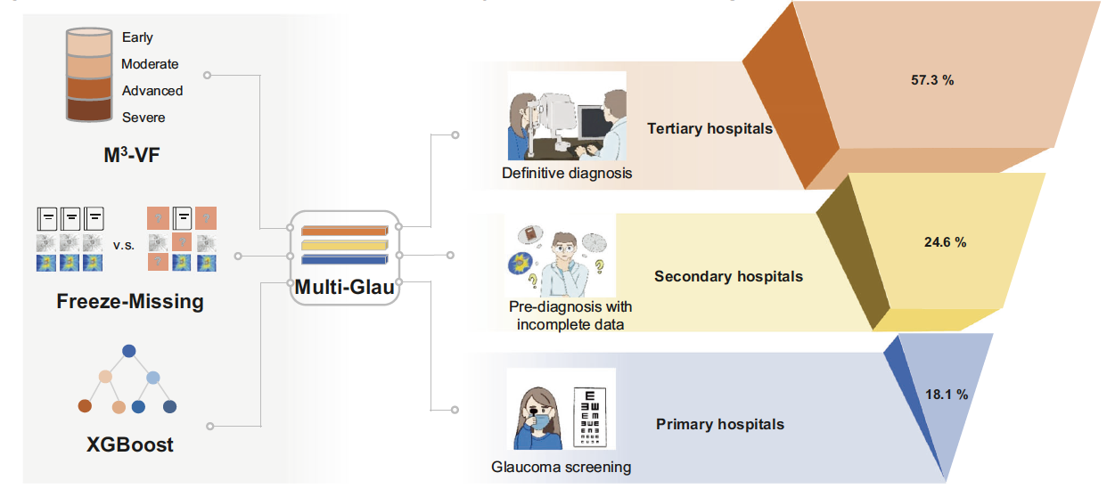 该研究针对我国青光眼诊疗中“医疗资源分布不均”和“关键诊断数据缺失”两大瓶颈问题,创新性提出多层级人工智能系统 Multi-Glau,依托分级诊疗制度,通过三大功能模块协同覆盖基层筛查、二级预诊断、三级精准分型,从而推动诊疗能力在各级医院间的同质化发展。