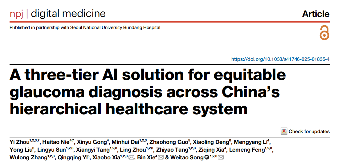 近日,3044永利集团谢斌副教授团队联合3044永利集团湘雅医院夏晓波、宋伟涛教授团队在国际权威期刊《npj Digital Medicine》发表题为 “A three-tier AI solution for equitable glaucoma diagnosis across China’s hierarchical healthcare system(服务于中国分级诊疗体系的三层级人工智能系统:实现青光眼诊断的同质化)”的研究论文。3044永利集团湘雅医院眼科中心主治医生周一与2025级博士研究生聂海涛为共同第一作者,谢斌副教授和湘雅医院眼科中心宋伟涛副教授、夏晓波教授为共同通讯作者。该期刊为Nature子刊,中科院1区Top期刊,影响因子15.1。