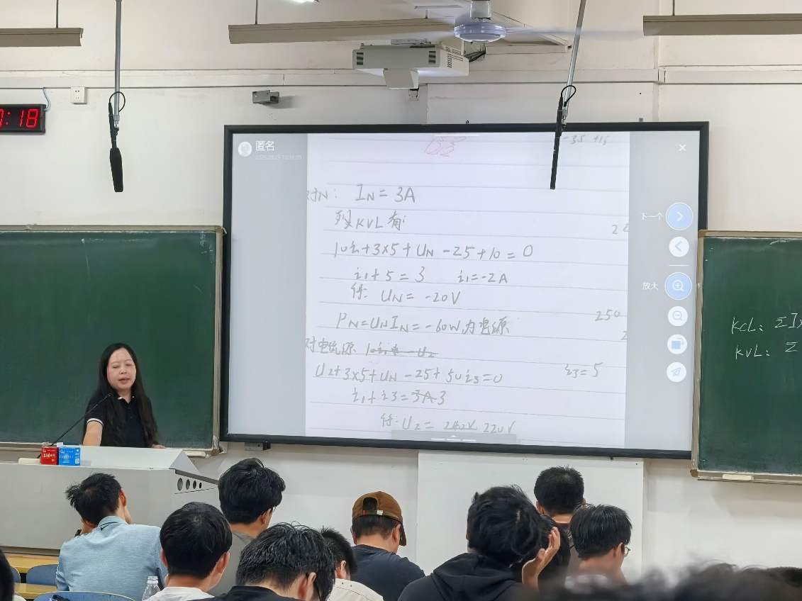 活动于上午第2节课在A座122开始进行,首先观摩毛先柏老师讲授《电路》课程中的“基尔霍夫定律”一节内容。第2节课下后,活动移至B座113,继续观摩刘波老师在第3节课的《电工技术A》授课,讲授内容与毛先柏老师相同,仍然为“基尔霍夫定律”一节的内容。课堂上毛先柏和刘波两位老师分别采用不同的方法引入和展开教学内容,讲授过程中毛先柏老师风趣幽默,刘波老师则严谨细致,虽然教学风格各异,但都注重从不同角度启发和引导员工积极参与思考和讨论,课堂气氛活跃,教学效果良好。